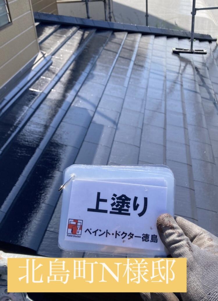 北島町N様邸、屋根塗装上塗り完了です。
