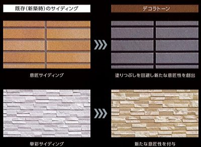 お客様のお宝物となるお家を、さまざまな塗料を用いて新築以上にする事こそ私達の仕事です。サイディングの模様が気に入っている方は、透明なクリヤー塗装だけではなく気軽にデコラトーンでお願いしますとお声がけくださいね。