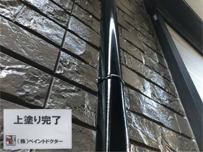 濃い色の外壁に沿った黒い縦樋を、艶のある塗料で丁寧に仕上げました。弊社では太陽光の影響を受けやすい付帯部や屋根は艶のある材料を基本的にはお勧めしています。強い艶感で太陽光を反射させ、光による劣化を抑える効果が期待できます。