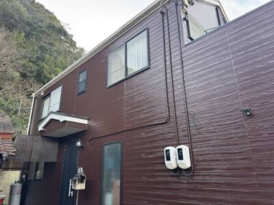 今回のお住まいは、背後に緑豊かな山が迫るロケーションに建つ住宅です。横張りの木目調サイディングを採用し、濃淡のある茶色で本物の板張りのような質感を表現しました。ガレージシャッター上部や2階外壁まで色味をそろえることで、周囲の山の緑となじむ、落ち着いた外観に仕上がっています。既存の建物とのバランスも意識しながら、全体の印象をすっきりと整えました。